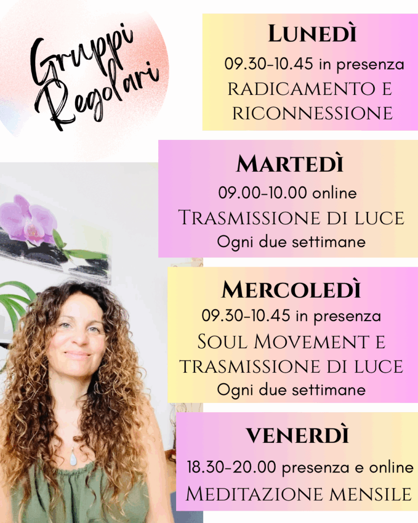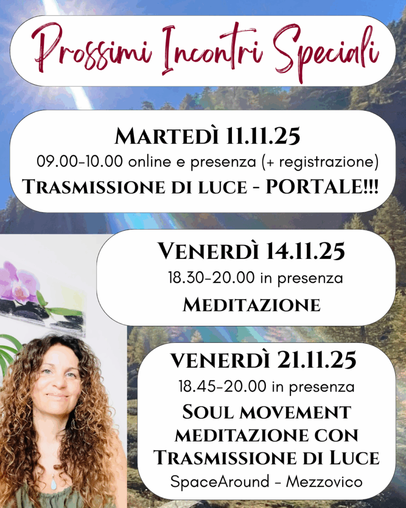 Incontri di profonda connessione e unione con noi stessi, il nostro corpo, il nostro respiro, la nostra presenza nel Qui e Ora, la nostra Anima, le nostre guide, Esseri di luce di terra, aria, acqua, fuoco e cielo, Light Codes and Light Language.